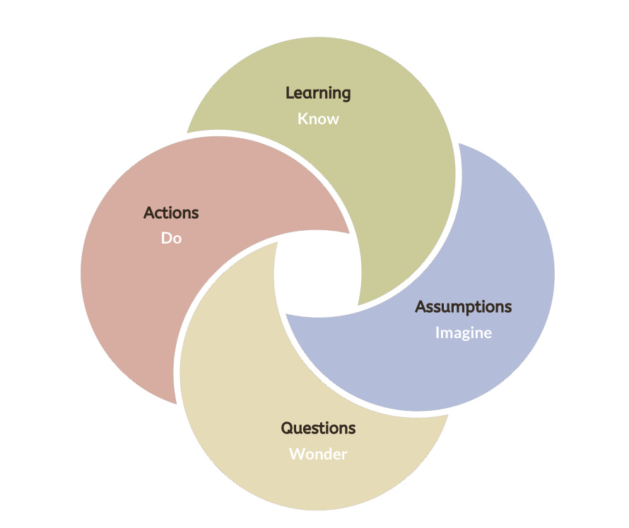 In the Learning conversation, people engage their gifts of knowing. They share what they know for sure relative to what they care about. In the Assumptions conversation, people engage their gifts of imagining. They share their hopes, concerns, and expectations. In the Questions conversation, people engage their gifts of wonder. They turn all of their assumptions into questions. In the Actions conversation, people engage their gifts of doing. They answer their most important questions by finding something out or trying something out.
